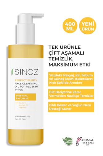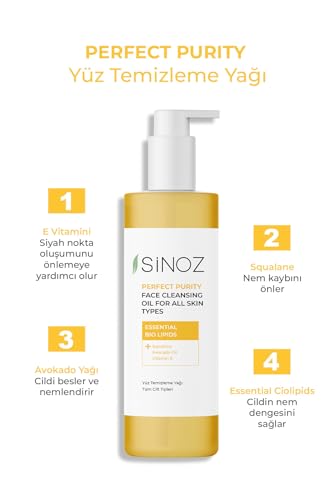 KEY INGREDIENTS Salicylic Acid, Niacinamide, Zinc PCA BENEFITS Sebum balance, Deep and gentle cleansing, anti-acne care, moisturization HOW TO USE Pump a sufficient amount into your plam and foam it up with water. Gently wash your face with the foam and rinse completely with water. WARNINGS Avoid direct contact with the eyes, in case of contact wash with plenty of water. INDICATIONS Oily and combination skin, acne prone skin CONTRAINDICATIONS No specific contraindication is observed. STORAGE In its original package, with the lid closed, at room temparature, away from direct sun light, out of reach of children SHELF LIFE 3 years after production DESCRIPTIONS Sinoz Perfect Purity Face Cleansing Oil quickly and deeply dissolves make-up, sunscreen, excess sebum and pollution residues on the face. Its moisturizing formula allows to cleanse skin without drying the skin and feeling tightness. INGREDIENTS Helianthus Annuus Seed Oil, C12-15 Alkyl Benzoate, Brassica Campestris Seed Oil , Laureth-4, Polyglyceryl-3 Oleate, Diethylhexyl Sodium Sulfosuccinate, C13-15 Alkane, Laureth-3, MIPA-Laureth Sulfate, Squalane, Persea Gratissima Oil, Tocopheryl Acetate, Phospholipids, Glycine Soja (Soybean) Oil, Glycolipids, Glycine Soja (Soybean) Sterols, Aqua, Laureth-7 Citrate, Propylene Glycol , Parfum, PPG-26-Buteth-26. Made in Türkiye 8681925607950
